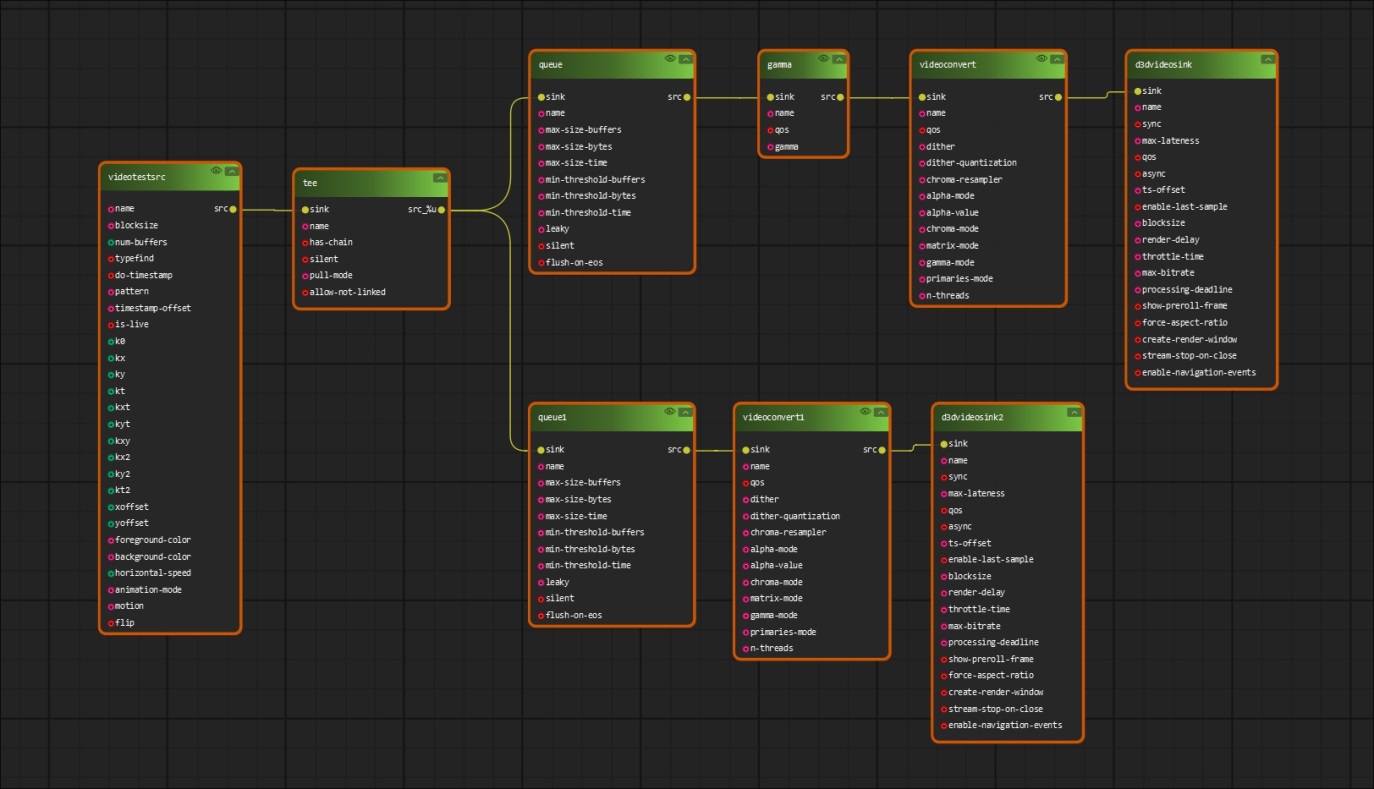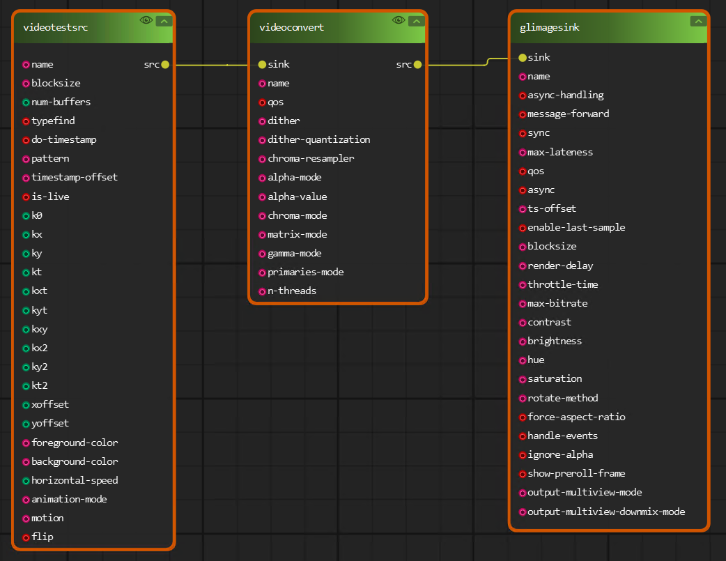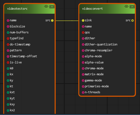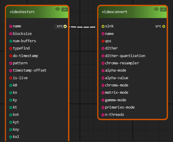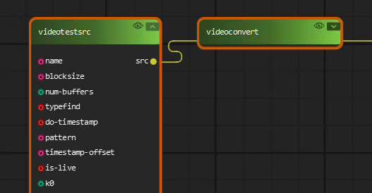 To connect elements, left-click the source’s element GstPin and drag it to the target’s GstPin. GstPin includes src and sink. In the following example, The left figure is a sink GstPin connected to a src GstPin. The right figure is a src GstPin connected to a sink GstPin.