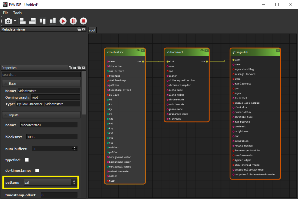 Following from the example in Use Case 1, in the stop state, select the videotestsrc element and modify its pattern property to ball.
