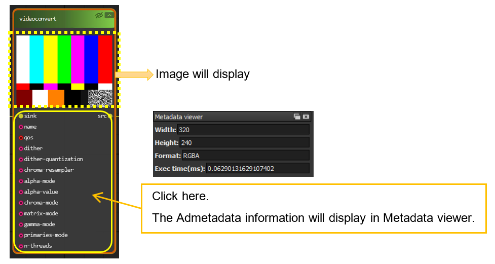 Admetadata information includes the width, height and format of the video, execution time (ms), and inference information (if any) in the specified element.