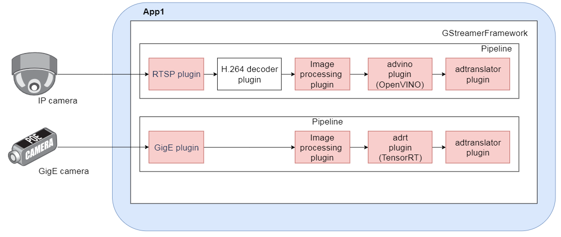 All the plugins can be easily assembled to become a pipeline that can form an application. There are three kinds of plugins: source providers (image/video capture), filters (image processing/image analytics), and data consumers (connector plugins). Source providers play a leading role in the pipeline, transmitting data to an intermediate filter that deals with the data for specific processing. The data can then be consumed by the final plugins for data storage and transmission.
